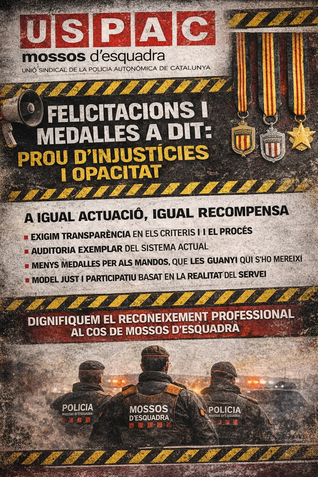 Des de la USPAC tornem a denunciar, amb tota contundència, una problemàtica estructural que fa anys que arrosseguem i que lluny de corregir-se, s’ha consolidat com una de les principals fonts de malestar dins del Cos de Mossos d’Esquadra: el sistema de concessió de felicitacions i medalles.