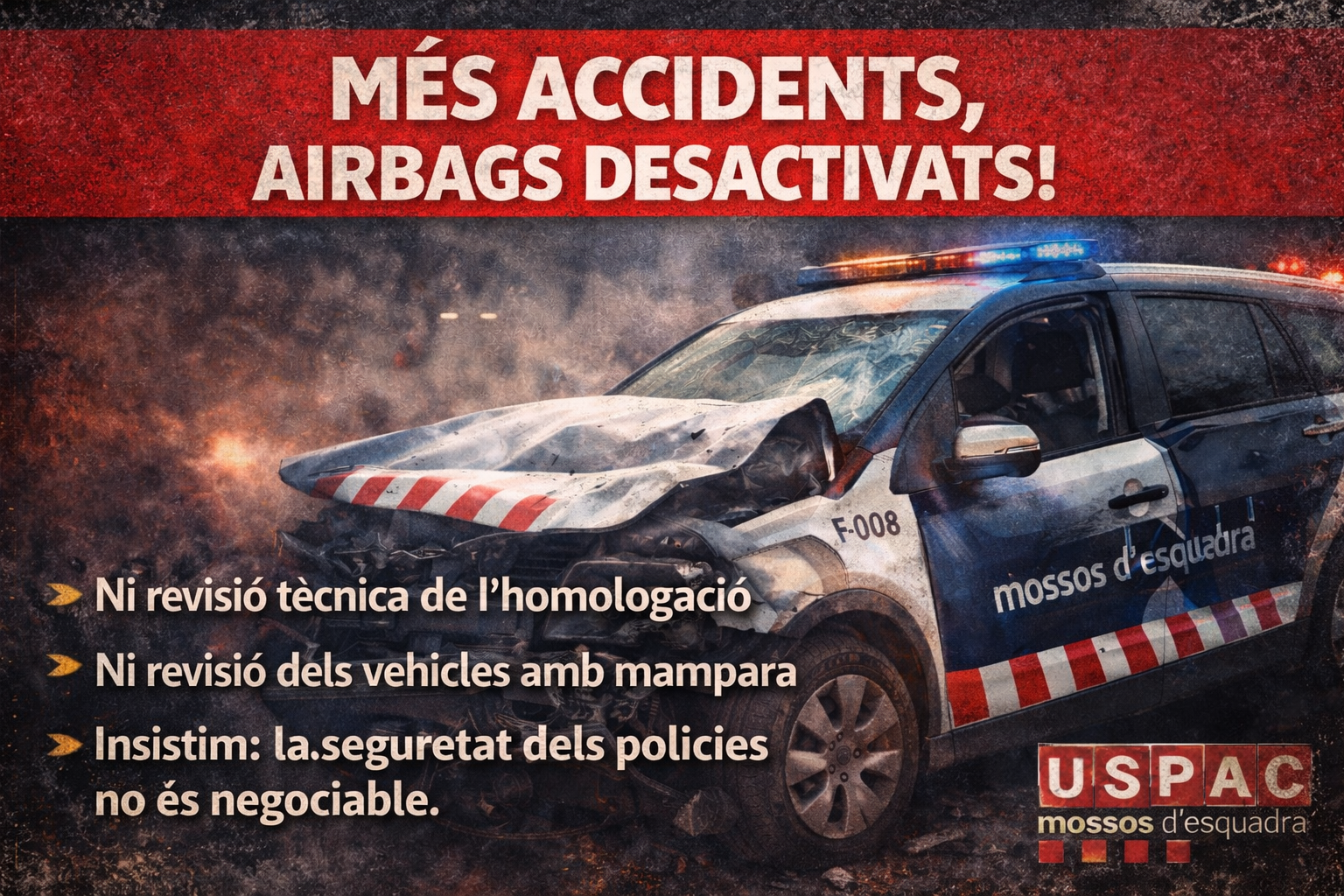 Des d’USPAC hem registrat un escrit adreçat a la consellera d’Interior i Seguretat Pública per traslladar la nostra profunda preocupació davant un nou accident de trànsit amb un vehicle patrulla del Cos de Mossos d’Esquadra en què els airbags no s’han activat.